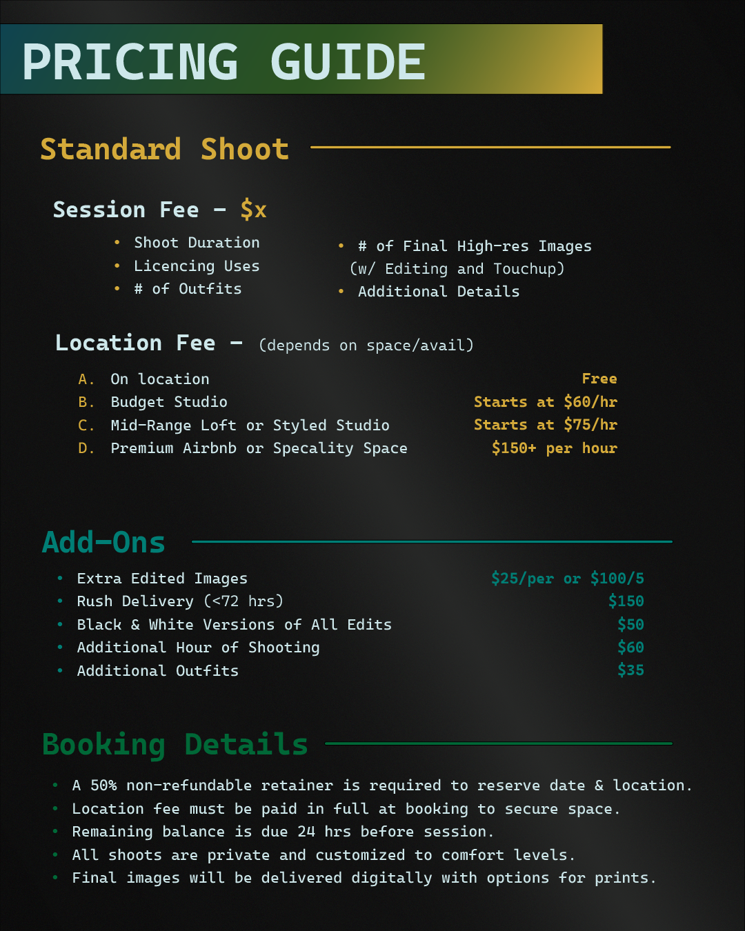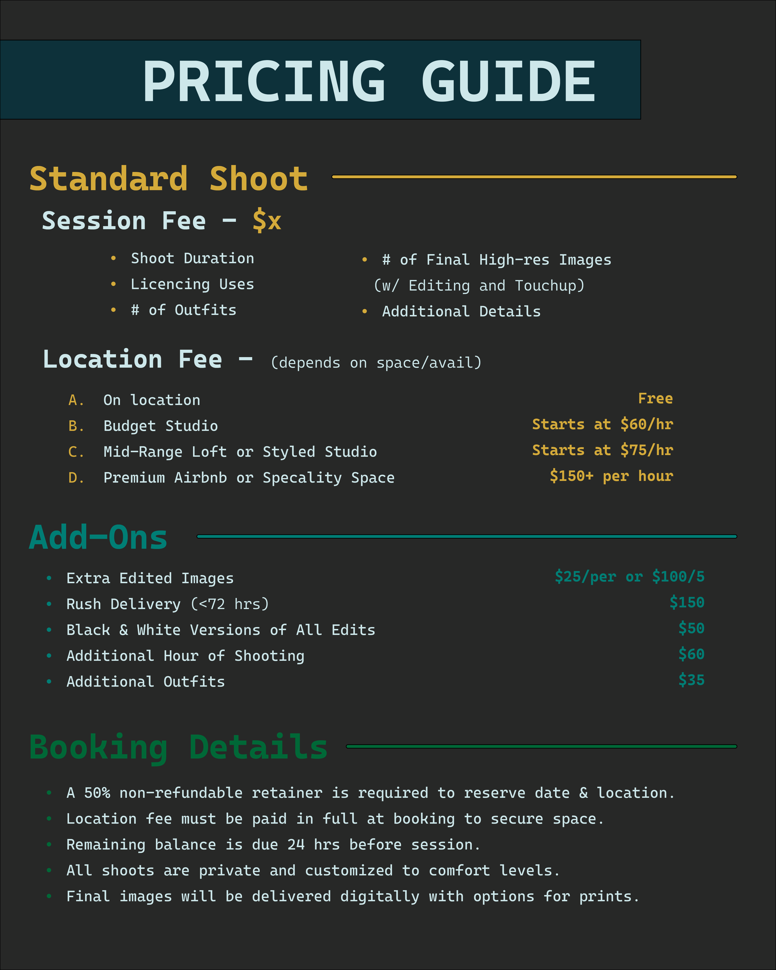 Please use the Contact Form if there is anything else you need that is not listed, or if you need more affordable options. All bookings require a retainer fee that is used to hold your date and then applied to the final purchase, or you can pay for the service in full. Full Terms of Service is listed here.